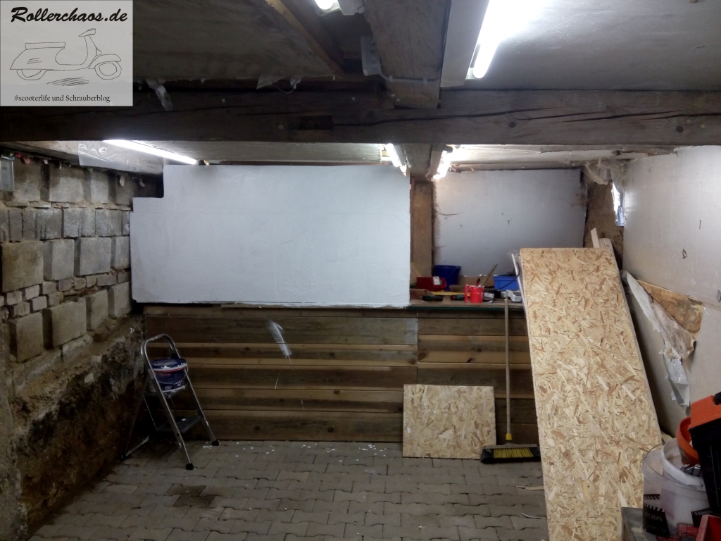 Das Podest im hinteren Bereich ist eine bauliche Besonderheit des neuen Raums. Darunter befinden sich ein Abwasserrohr und Teile des Fundaments. Die Holzverkleidung darum hatte der Vormieter, ein Quadschrauber, eingebaut und als Werkbank benutzt. Für mich ist dies keine Option, das Podest soll als "bekriechbares" Lager dienen und wurde darum teilweise räumlich abgegrenzt.